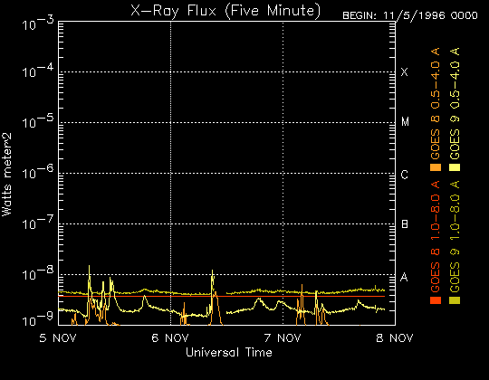 Die Daten in der obigen Grafik wurden geändert, um den Skalierungsfaktor des Space Weather Prediction Center (SWPC) zu entfernen. Durch den SWPC-Skalierungsfaktors für die Flare-Indizes werden die operativen Daten um 42 % kleiner angegeben als für die wissenschaftlichen Qualitätsdaten. Der Skalierungsfaktor wurde auch aus der Liste der Sonneneruptionen entfernt, um die tatsächlichen physikalischen Einheiten wiederzugeben.