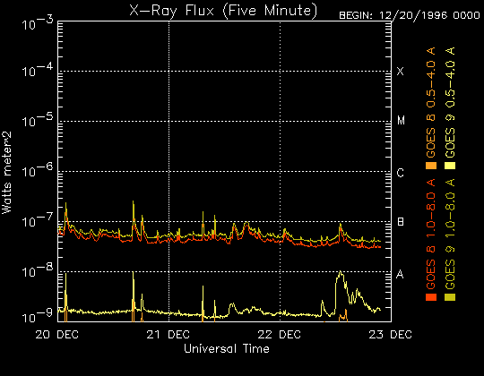 Die Daten in der obigen Grafik wurden geändert, um den Skalierungsfaktor des Space Weather Prediction Center (SWPC) zu entfernen. Durch den SWPC-Skalierungsfaktors für die Flare-Indizes werden die operativen Daten um 42 % kleiner angegeben als für die wissenschaftlichen Qualitätsdaten. Der Skalierungsfaktor wurde auch aus der Liste der Sonneneruptionen entfernt, um die tatsächlichen physikalischen Einheiten wiederzugeben.
