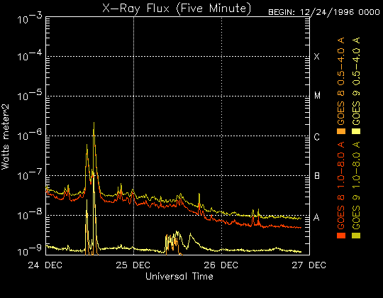 Die Daten in der obigen Grafik wurden geändert, um den Skalierungsfaktor des Space Weather Prediction Center (SWPC) zu entfernen. Durch den SWPC-Skalierungsfaktors für die Flare-Indizes werden die operativen Daten um 42 % kleiner angegeben als für die wissenschaftlichen Qualitätsdaten. Der Skalierungsfaktor wurde auch aus der Liste der Sonneneruptionen entfernt, um die tatsächlichen physikalischen Einheiten wiederzugeben.