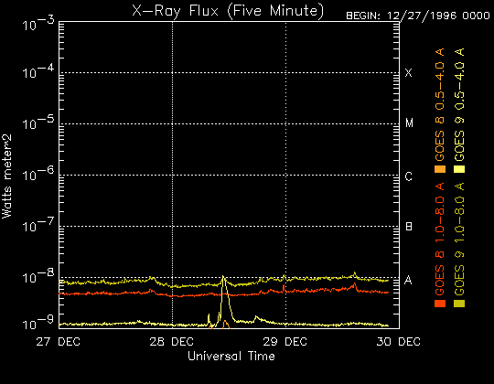Die Daten in der obigen Grafik wurden geändert, um den Skalierungsfaktor des Space Weather Prediction Center (SWPC) zu entfernen. Durch den SWPC-Skalierungsfaktors für die Flare-Indizes werden die operativen Daten um 42 % kleiner angegeben als für die wissenschaftlichen Qualitätsdaten. Der Skalierungsfaktor wurde auch aus der Liste der Sonneneruptionen entfernt, um die tatsächlichen physikalischen Einheiten wiederzugeben.