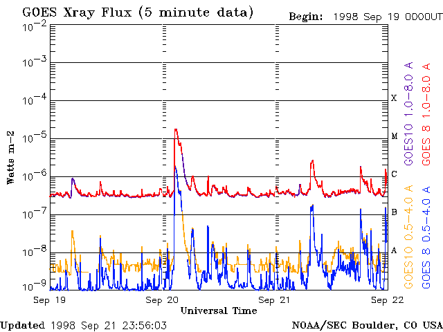 Die Daten in der obigen Grafik wurden geändert, um den Skalierungsfaktor des Space Weather Prediction Center (SWPC) zu entfernen. Durch den SWPC-Skalierungsfaktors für die Flare-Indizes werden die operativen Daten um 42 % kleiner angegeben als für die wissenschaftlichen Qualitätsdaten. Der Skalierungsfaktor wurde auch aus der Liste der Sonneneruptionen entfernt, um die tatsächlichen physikalischen Einheiten wiederzugeben.