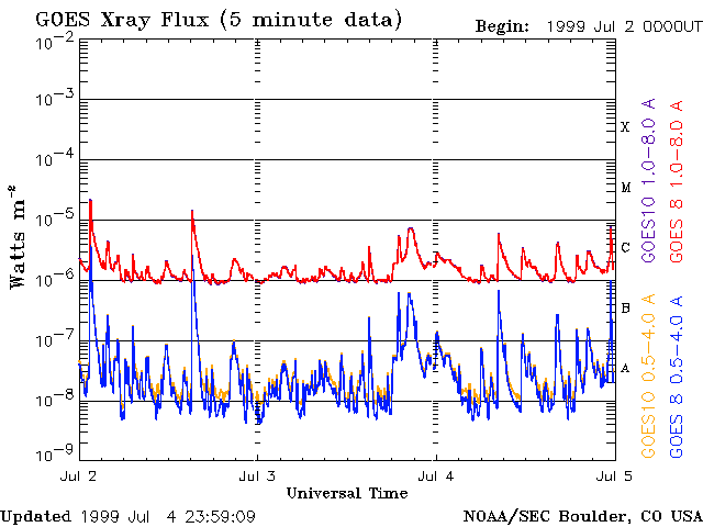 Die Daten in der obigen Grafik wurden geändert, um den Skalierungsfaktor des Space Weather Prediction Center (SWPC) zu entfernen. Durch den SWPC-Skalierungsfaktors für die Flare-Indizes werden die operativen Daten um 42 % kleiner angegeben als für die wissenschaftlichen Qualitätsdaten. Der Skalierungsfaktor wurde auch aus der Liste der Sonneneruptionen entfernt, um die tatsächlichen physikalischen Einheiten wiederzugeben.