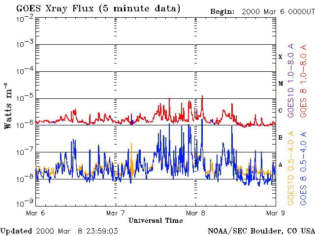 Die Daten in der obigen Grafik wurden geändert, um den Skalierungsfaktor des Space Weather Prediction Center (SWPC) zu entfernen. Durch den SWPC-Skalierungsfaktors für die Flare-Indizes werden die operativen Daten um 42 % kleiner angegeben als für die wissenschaftlichen Qualitätsdaten. Der Skalierungsfaktor wurde auch aus der Liste der Sonneneruptionen entfernt, um die tatsächlichen physikalischen Einheiten wiederzugeben.