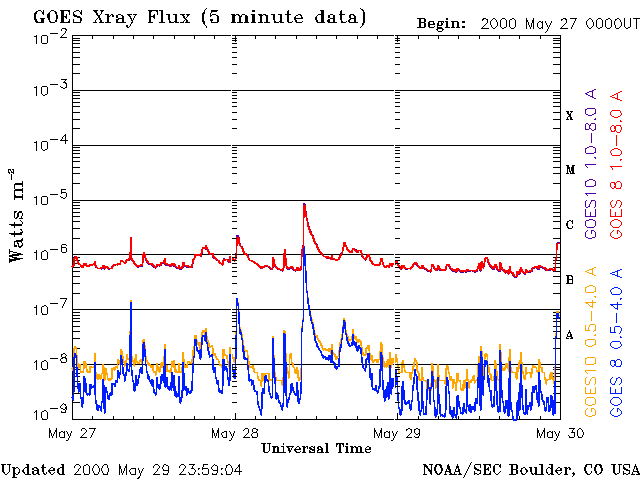 Die Daten in der obigen Grafik wurden geändert, um den Skalierungsfaktor des Space Weather Prediction Center (SWPC) zu entfernen. Durch den SWPC-Skalierungsfaktors für die Flare-Indizes werden die operativen Daten um 42 % kleiner angegeben als für die wissenschaftlichen Qualitätsdaten. Der Skalierungsfaktor wurde auch aus der Liste der Sonneneruptionen entfernt, um die tatsächlichen physikalischen Einheiten wiederzugeben.