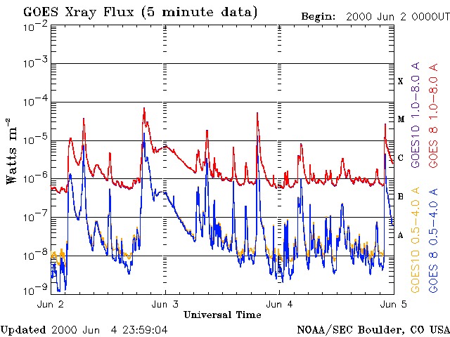 Die Daten in der obigen Grafik wurden geändert, um den Skalierungsfaktor des Space Weather Prediction Center (SWPC) zu entfernen. Durch den SWPC-Skalierungsfaktors für die Flare-Indizes werden die operativen Daten um 42 % kleiner angegeben als für die wissenschaftlichen Qualitätsdaten. Der Skalierungsfaktor wurde auch aus der Liste der Sonneneruptionen entfernt, um die tatsächlichen physikalischen Einheiten wiederzugeben.