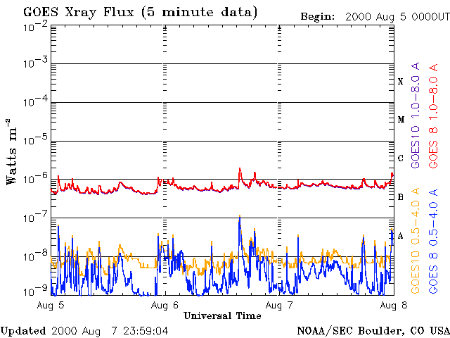 Die Daten in der obigen Grafik wurden geändert, um den Skalierungsfaktor des Space Weather Prediction Center (SWPC) zu entfernen. Durch den SWPC-Skalierungsfaktors für die Flare-Indizes werden die operativen Daten um 42 % kleiner angegeben als für die wissenschaftlichen Qualitätsdaten. Der Skalierungsfaktor wurde auch aus der Liste der Sonneneruptionen entfernt, um die tatsächlichen physikalischen Einheiten wiederzugeben.