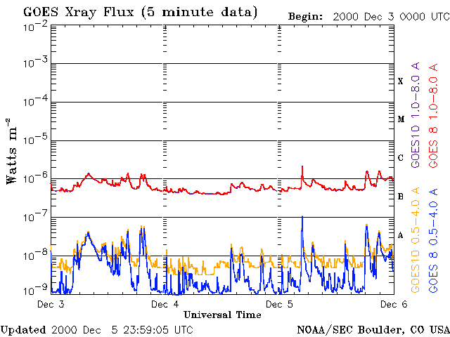 Die Daten in der obigen Grafik wurden geändert, um den Skalierungsfaktor des Space Weather Prediction Center (SWPC) zu entfernen. Durch den SWPC-Skalierungsfaktors für die Flare-Indizes werden die operativen Daten um 42 % kleiner angegeben als für die wissenschaftlichen Qualitätsdaten. Der Skalierungsfaktor wurde auch aus der Liste der Sonneneruptionen entfernt, um die tatsächlichen physikalischen Einheiten wiederzugeben.