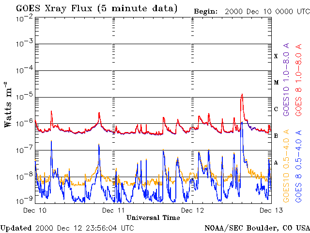 Die Daten in der obigen Grafik wurden geändert, um den Skalierungsfaktor des Space Weather Prediction Center (SWPC) zu entfernen. Durch den SWPC-Skalierungsfaktors für die Flare-Indizes werden die operativen Daten um 42 % kleiner angegeben als für die wissenschaftlichen Qualitätsdaten. Der Skalierungsfaktor wurde auch aus der Liste der Sonneneruptionen entfernt, um die tatsächlichen physikalischen Einheiten wiederzugeben.