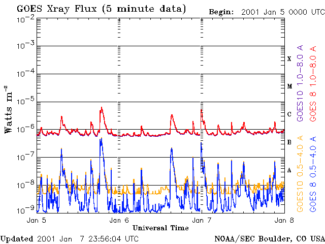 Die Daten in der obigen Grafik wurden geändert, um den Skalierungsfaktor des Space Weather Prediction Center (SWPC) zu entfernen. Durch den SWPC-Skalierungsfaktors für die Flare-Indizes werden die operativen Daten um 42 % kleiner angegeben als für die wissenschaftlichen Qualitätsdaten. Der Skalierungsfaktor wurde auch aus der Liste der Sonneneruptionen entfernt, um die tatsächlichen physikalischen Einheiten wiederzugeben.