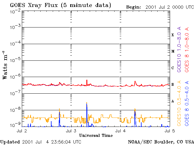 Die Daten in der obigen Grafik wurden geändert, um den Skalierungsfaktor des Space Weather Prediction Center (SWPC) zu entfernen. Durch den SWPC-Skalierungsfaktors für die Flare-Indizes werden die operativen Daten um 42 % kleiner angegeben als für die wissenschaftlichen Qualitätsdaten. Der Skalierungsfaktor wurde auch aus der Liste der Sonneneruptionen entfernt, um die tatsächlichen physikalischen Einheiten wiederzugeben.