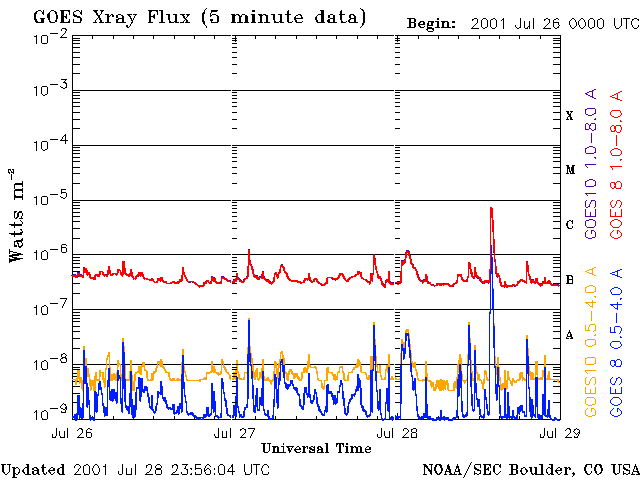 Die Daten in der obigen Grafik wurden geändert, um den Skalierungsfaktor des Space Weather Prediction Center (SWPC) zu entfernen. Durch den SWPC-Skalierungsfaktors für die Flare-Indizes werden die operativen Daten um 42 % kleiner angegeben als für die wissenschaftlichen Qualitätsdaten. Der Skalierungsfaktor wurde auch aus der Liste der Sonneneruptionen entfernt, um die tatsächlichen physikalischen Einheiten wiederzugeben.