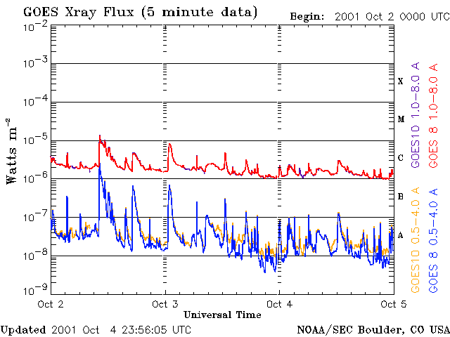 Die Daten in der obigen Grafik wurden geändert, um den Skalierungsfaktor des Space Weather Prediction Center (SWPC) zu entfernen. Durch den SWPC-Skalierungsfaktors für die Flare-Indizes werden die operativen Daten um 42 % kleiner angegeben als für die wissenschaftlichen Qualitätsdaten. Der Skalierungsfaktor wurde auch aus der Liste der Sonneneruptionen entfernt, um die tatsächlichen physikalischen Einheiten wiederzugeben.