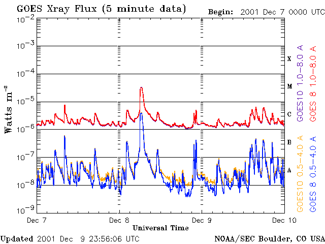 Die Daten in der obigen Grafik wurden geändert, um den Skalierungsfaktor des Space Weather Prediction Center (SWPC) zu entfernen. Durch den SWPC-Skalierungsfaktors für die Flare-Indizes werden die operativen Daten um 42 % kleiner angegeben als für die wissenschaftlichen Qualitätsdaten. Der Skalierungsfaktor wurde auch aus der Liste der Sonneneruptionen entfernt, um die tatsächlichen physikalischen Einheiten wiederzugeben.