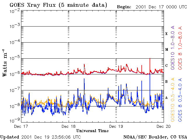 Die Daten in der obigen Grafik wurden geändert, um den Skalierungsfaktor des Space Weather Prediction Center (SWPC) zu entfernen. Durch den SWPC-Skalierungsfaktors für die Flare-Indizes werden die operativen Daten um 42 % kleiner angegeben als für die wissenschaftlichen Qualitätsdaten. Der Skalierungsfaktor wurde auch aus der Liste der Sonneneruptionen entfernt, um die tatsächlichen physikalischen Einheiten wiederzugeben.