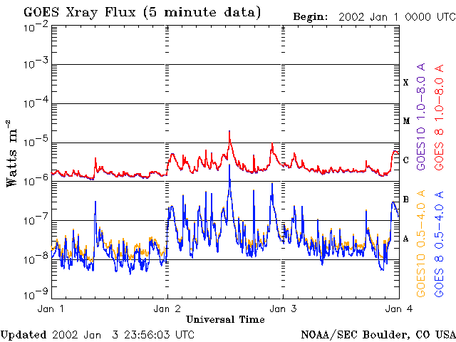Die Daten in der obigen Grafik wurden geändert, um den Skalierungsfaktor des Space Weather Prediction Center (SWPC) zu entfernen. Durch den SWPC-Skalierungsfaktors für die Flare-Indizes werden die operativen Daten um 42 % kleiner angegeben als für die wissenschaftlichen Qualitätsdaten. Der Skalierungsfaktor wurde auch aus der Liste der Sonneneruptionen entfernt, um die tatsächlichen physikalischen Einheiten wiederzugeben.