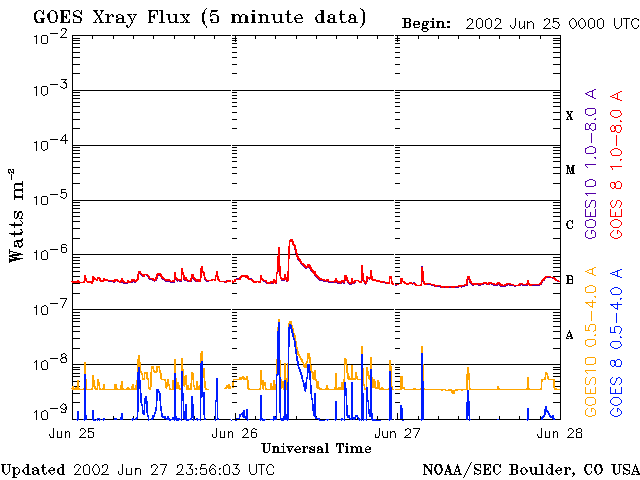 Die Daten in der obigen Grafik wurden geändert, um den Skalierungsfaktor des Space Weather Prediction Center (SWPC) zu entfernen. Durch den SWPC-Skalierungsfaktors für die Flare-Indizes werden die operativen Daten um 42 % kleiner angegeben als für die wissenschaftlichen Qualitätsdaten. Der Skalierungsfaktor wurde auch aus der Liste der Sonneneruptionen entfernt, um die tatsächlichen physikalischen Einheiten wiederzugeben.