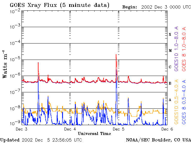Die Daten in der obigen Grafik wurden geändert, um den Skalierungsfaktor des Space Weather Prediction Center (SWPC) zu entfernen. Durch den SWPC-Skalierungsfaktors für die Flare-Indizes werden die operativen Daten um 42 % kleiner angegeben als für die wissenschaftlichen Qualitätsdaten. Der Skalierungsfaktor wurde auch aus der Liste der Sonneneruptionen entfernt, um die tatsächlichen physikalischen Einheiten wiederzugeben.