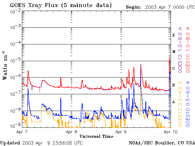 Die Daten in der obigen Grafik wurden geändert, um den Skalierungsfaktor des Space Weather Prediction Center (SWPC) zu entfernen. Durch den SWPC-Skalierungsfaktors für die Flare-Indizes werden die operativen Daten um 42 % kleiner angegeben als für die wissenschaftlichen Qualitätsdaten. Der Skalierungsfaktor wurde auch aus der Liste der Sonneneruptionen entfernt, um die tatsächlichen physikalischen Einheiten wiederzugeben.