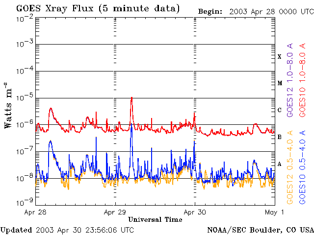 Die Daten in der obigen Grafik wurden geändert, um den Skalierungsfaktor des Space Weather Prediction Center (SWPC) zu entfernen. Durch den SWPC-Skalierungsfaktors für die Flare-Indizes werden die operativen Daten um 42 % kleiner angegeben als für die wissenschaftlichen Qualitätsdaten. Der Skalierungsfaktor wurde auch aus der Liste der Sonneneruptionen entfernt, um die tatsächlichen physikalischen Einheiten wiederzugeben.