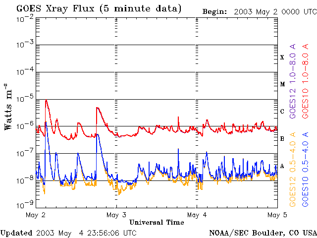 Die Daten in der obigen Grafik wurden geändert, um den Skalierungsfaktor des Space Weather Prediction Center (SWPC) zu entfernen. Durch den SWPC-Skalierungsfaktors für die Flare-Indizes werden die operativen Daten um 42 % kleiner angegeben als für die wissenschaftlichen Qualitätsdaten. Der Skalierungsfaktor wurde auch aus der Liste der Sonneneruptionen entfernt, um die tatsächlichen physikalischen Einheiten wiederzugeben.