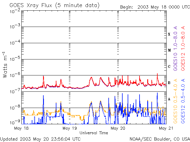 Die Daten in der obigen Grafik wurden geändert, um den Skalierungsfaktor des Space Weather Prediction Center (SWPC) zu entfernen. Durch den SWPC-Skalierungsfaktors für die Flare-Indizes werden die operativen Daten um 42 % kleiner angegeben als für die wissenschaftlichen Qualitätsdaten. Der Skalierungsfaktor wurde auch aus der Liste der Sonneneruptionen entfernt, um die tatsächlichen physikalischen Einheiten wiederzugeben.