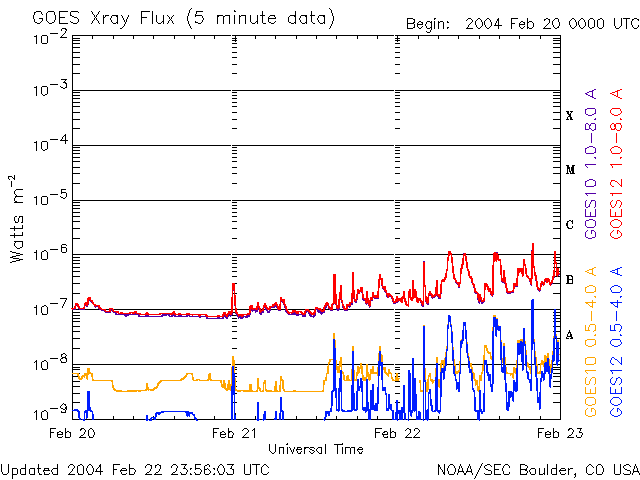 Die Daten in der obigen Grafik wurden geändert, um den Skalierungsfaktor des Space Weather Prediction Center (SWPC) zu entfernen. Durch den SWPC-Skalierungsfaktors für die Flare-Indizes werden die operativen Daten um 42 % kleiner angegeben als für die wissenschaftlichen Qualitätsdaten. Der Skalierungsfaktor wurde auch aus der Liste der Sonneneruptionen entfernt, um die tatsächlichen physikalischen Einheiten wiederzugeben.