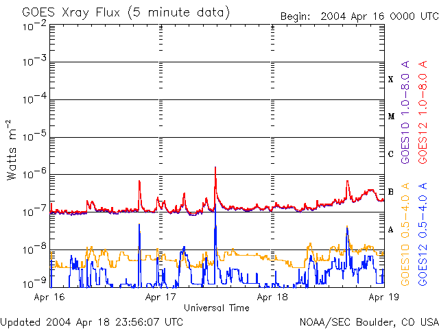 Die Daten in der obigen Grafik wurden geändert, um den Skalierungsfaktor des Space Weather Prediction Center (SWPC) zu entfernen. Durch den SWPC-Skalierungsfaktors für die Flare-Indizes werden die operativen Daten um 42 % kleiner angegeben als für die wissenschaftlichen Qualitätsdaten. Der Skalierungsfaktor wurde auch aus der Liste der Sonneneruptionen entfernt, um die tatsächlichen physikalischen Einheiten wiederzugeben.