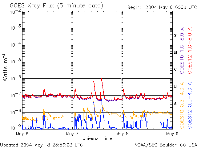 Die Daten in der obigen Grafik wurden geändert, um den Skalierungsfaktor des Space Weather Prediction Center (SWPC) zu entfernen. Durch den SWPC-Skalierungsfaktors für die Flare-Indizes werden die operativen Daten um 42 % kleiner angegeben als für die wissenschaftlichen Qualitätsdaten. Der Skalierungsfaktor wurde auch aus der Liste der Sonneneruptionen entfernt, um die tatsächlichen physikalischen Einheiten wiederzugeben.
