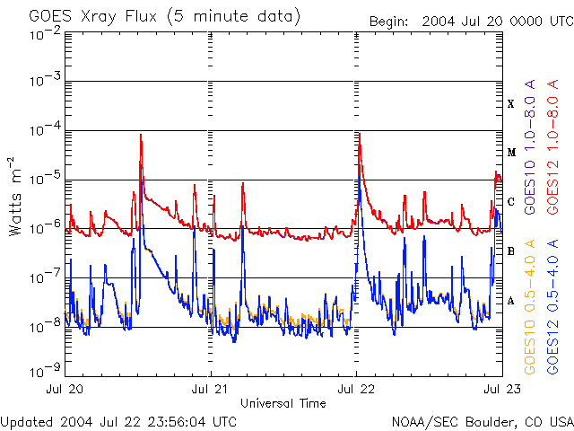 Die Daten in der obigen Grafik wurden geändert, um den Skalierungsfaktor des Space Weather Prediction Center (SWPC) zu entfernen. Durch den SWPC-Skalierungsfaktors für die Flare-Indizes werden die operativen Daten um 42 % kleiner angegeben als für die wissenschaftlichen Qualitätsdaten. Der Skalierungsfaktor wurde auch aus der Liste der Sonneneruptionen entfernt, um die tatsächlichen physikalischen Einheiten wiederzugeben.