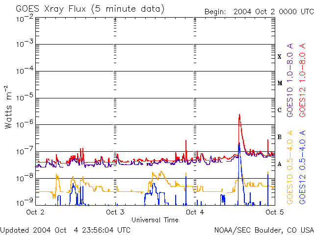 Die Daten in der obigen Grafik wurden geändert, um den Skalierungsfaktor des Space Weather Prediction Center (SWPC) zu entfernen. Durch den SWPC-Skalierungsfaktors für die Flare-Indizes werden die operativen Daten um 42 % kleiner angegeben als für die wissenschaftlichen Qualitätsdaten. Der Skalierungsfaktor wurde auch aus der Liste der Sonneneruptionen entfernt, um die tatsächlichen physikalischen Einheiten wiederzugeben.