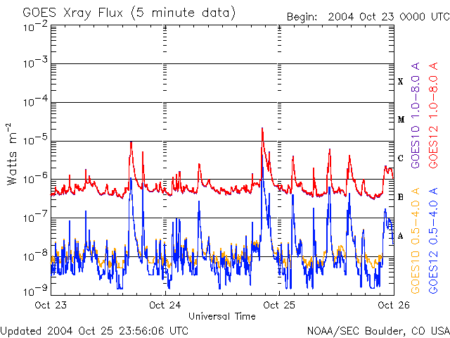 Die Daten in der obigen Grafik wurden geändert, um den Skalierungsfaktor des Space Weather Prediction Center (SWPC) zu entfernen. Durch den SWPC-Skalierungsfaktors für die Flare-Indizes werden die operativen Daten um 42 % kleiner angegeben als für die wissenschaftlichen Qualitätsdaten. Der Skalierungsfaktor wurde auch aus der Liste der Sonneneruptionen entfernt, um die tatsächlichen physikalischen Einheiten wiederzugeben.