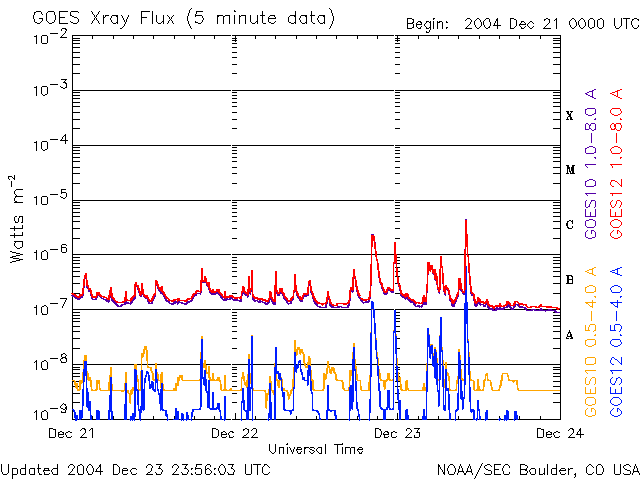 Die Daten in der obigen Grafik wurden geändert, um den Skalierungsfaktor des Space Weather Prediction Center (SWPC) zu entfernen. Durch den SWPC-Skalierungsfaktors für die Flare-Indizes werden die operativen Daten um 42 % kleiner angegeben als für die wissenschaftlichen Qualitätsdaten. Der Skalierungsfaktor wurde auch aus der Liste der Sonneneruptionen entfernt, um die tatsächlichen physikalischen Einheiten wiederzugeben.