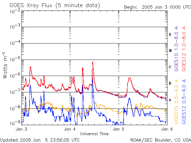 Die Daten in der obigen Grafik wurden geändert, um den Skalierungsfaktor des Space Weather Prediction Center (SWPC) zu entfernen. Durch den SWPC-Skalierungsfaktors für die Flare-Indizes werden die operativen Daten um 42 % kleiner angegeben als für die wissenschaftlichen Qualitätsdaten. Der Skalierungsfaktor wurde auch aus der Liste der Sonneneruptionen entfernt, um die tatsächlichen physikalischen Einheiten wiederzugeben.