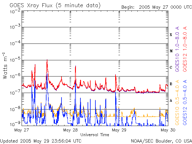 Die Daten in der obigen Grafik wurden geändert, um den Skalierungsfaktor des Space Weather Prediction Center (SWPC) zu entfernen. Durch den SWPC-Skalierungsfaktors für die Flare-Indizes werden die operativen Daten um 42 % kleiner angegeben als für die wissenschaftlichen Qualitätsdaten. Der Skalierungsfaktor wurde auch aus der Liste der Sonneneruptionen entfernt, um die tatsächlichen physikalischen Einheiten wiederzugeben.