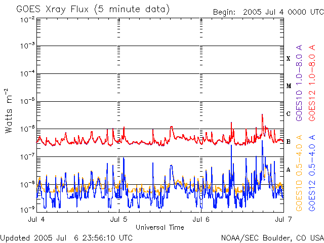 Die Daten in der obigen Grafik wurden geändert, um den Skalierungsfaktor des Space Weather Prediction Center (SWPC) zu entfernen. Durch den SWPC-Skalierungsfaktors für die Flare-Indizes werden die operativen Daten um 42 % kleiner angegeben als für die wissenschaftlichen Qualitätsdaten. Der Skalierungsfaktor wurde auch aus der Liste der Sonneneruptionen entfernt, um die tatsächlichen physikalischen Einheiten wiederzugeben.