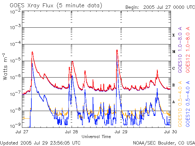 Die Daten in der obigen Grafik wurden geändert, um den Skalierungsfaktor des Space Weather Prediction Center (SWPC) zu entfernen. Durch den SWPC-Skalierungsfaktors für die Flare-Indizes werden die operativen Daten um 42 % kleiner angegeben als für die wissenschaftlichen Qualitätsdaten. Der Skalierungsfaktor wurde auch aus der Liste der Sonneneruptionen entfernt, um die tatsächlichen physikalischen Einheiten wiederzugeben.
