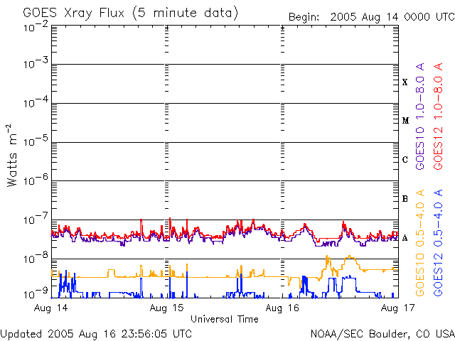 Die Daten in der obigen Grafik wurden geändert, um den Skalierungsfaktor des Space Weather Prediction Center (SWPC) zu entfernen. Durch den SWPC-Skalierungsfaktors für die Flare-Indizes werden die operativen Daten um 42 % kleiner angegeben als für die wissenschaftlichen Qualitätsdaten. Der Skalierungsfaktor wurde auch aus der Liste der Sonneneruptionen entfernt, um die tatsächlichen physikalischen Einheiten wiederzugeben.