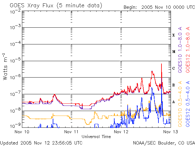 Die Daten in der obigen Grafik wurden geändert, um den Skalierungsfaktor des Space Weather Prediction Center (SWPC) zu entfernen. Durch den SWPC-Skalierungsfaktors für die Flare-Indizes werden die operativen Daten um 42 % kleiner angegeben als für die wissenschaftlichen Qualitätsdaten. Der Skalierungsfaktor wurde auch aus der Liste der Sonneneruptionen entfernt, um die tatsächlichen physikalischen Einheiten wiederzugeben.