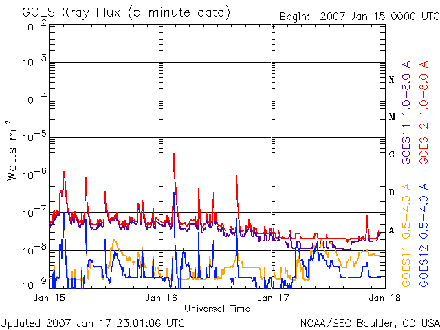 Die Daten in der obigen Grafik wurden geändert, um den Skalierungsfaktor des Space Weather Prediction Center (SWPC) zu entfernen. Durch den SWPC-Skalierungsfaktors für die Flare-Indizes werden die operativen Daten um 42 % kleiner angegeben als für die wissenschaftlichen Qualitätsdaten. Der Skalierungsfaktor wurde auch aus der Liste der Sonneneruptionen entfernt, um die tatsächlichen physikalischen Einheiten wiederzugeben.