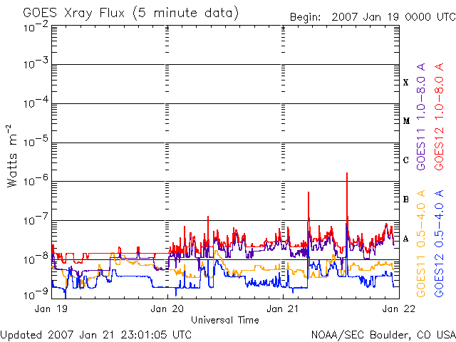 Die Daten in der obigen Grafik wurden geändert, um den Skalierungsfaktor des Space Weather Prediction Center (SWPC) zu entfernen. Durch den SWPC-Skalierungsfaktors für die Flare-Indizes werden die operativen Daten um 42 % kleiner angegeben als für die wissenschaftlichen Qualitätsdaten. Der Skalierungsfaktor wurde auch aus der Liste der Sonneneruptionen entfernt, um die tatsächlichen physikalischen Einheiten wiederzugeben.