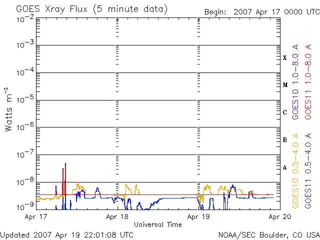 Die Daten in der obigen Grafik wurden geändert, um den Skalierungsfaktor des Space Weather Prediction Center (SWPC) zu entfernen. Durch den SWPC-Skalierungsfaktors für die Flare-Indizes werden die operativen Daten um 42 % kleiner angegeben als für die wissenschaftlichen Qualitätsdaten. Der Skalierungsfaktor wurde auch aus der Liste der Sonneneruptionen entfernt, um die tatsächlichen physikalischen Einheiten wiederzugeben.