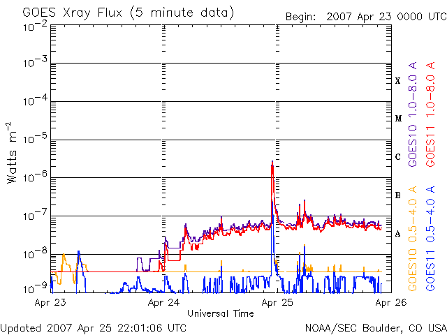 Die Daten in der obigen Grafik wurden geändert, um den Skalierungsfaktor des Space Weather Prediction Center (SWPC) zu entfernen. Durch den SWPC-Skalierungsfaktors für die Flare-Indizes werden die operativen Daten um 42 % kleiner angegeben als für die wissenschaftlichen Qualitätsdaten. Der Skalierungsfaktor wurde auch aus der Liste der Sonneneruptionen entfernt, um die tatsächlichen physikalischen Einheiten wiederzugeben.