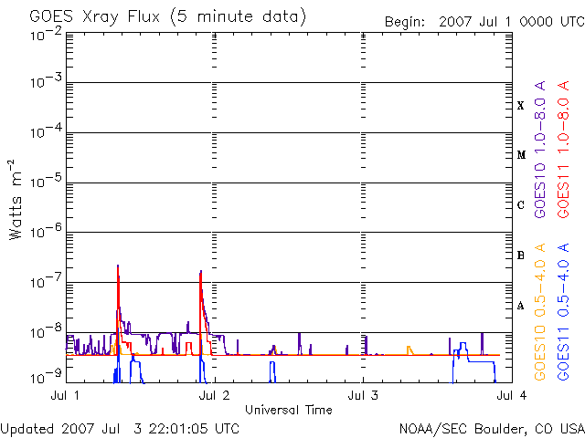 Die Daten in der obigen Grafik wurden geändert, um den Skalierungsfaktor des Space Weather Prediction Center (SWPC) zu entfernen. Durch den SWPC-Skalierungsfaktors für die Flare-Indizes werden die operativen Daten um 42 % kleiner angegeben als für die wissenschaftlichen Qualitätsdaten. Der Skalierungsfaktor wurde auch aus der Liste der Sonneneruptionen entfernt, um die tatsächlichen physikalischen Einheiten wiederzugeben.