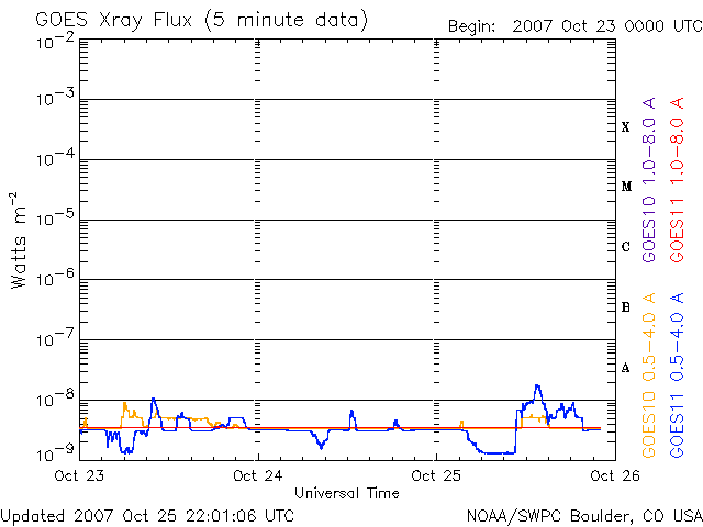 Die Daten in der obigen Grafik wurden geändert, um den Skalierungsfaktor des Space Weather Prediction Center (SWPC) zu entfernen. Durch den SWPC-Skalierungsfaktors für die Flare-Indizes werden die operativen Daten um 42 % kleiner angegeben als für die wissenschaftlichen Qualitätsdaten. Der Skalierungsfaktor wurde auch aus der Liste der Sonneneruptionen entfernt, um die tatsächlichen physikalischen Einheiten wiederzugeben.