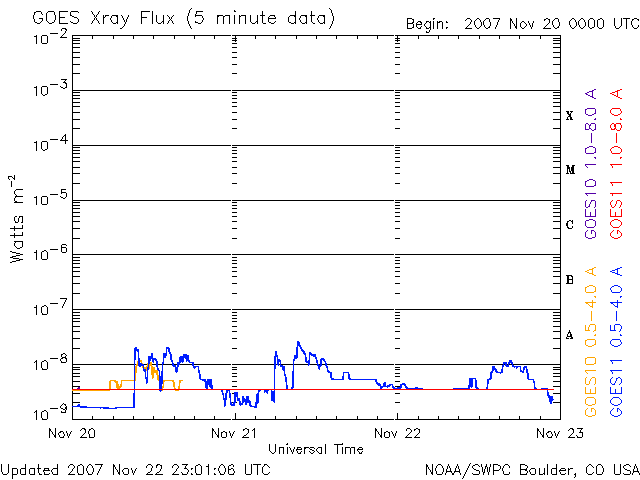 Die Daten in der obigen Grafik wurden geändert, um den Skalierungsfaktor des Space Weather Prediction Center (SWPC) zu entfernen. Durch den SWPC-Skalierungsfaktors für die Flare-Indizes werden die operativen Daten um 42 % kleiner angegeben als für die wissenschaftlichen Qualitätsdaten. Der Skalierungsfaktor wurde auch aus der Liste der Sonneneruptionen entfernt, um die tatsächlichen physikalischen Einheiten wiederzugeben.