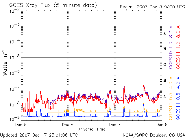 Die Daten in der obigen Grafik wurden geändert, um den Skalierungsfaktor des Space Weather Prediction Center (SWPC) zu entfernen. Durch den SWPC-Skalierungsfaktors für die Flare-Indizes werden die operativen Daten um 42 % kleiner angegeben als für die wissenschaftlichen Qualitätsdaten. Der Skalierungsfaktor wurde auch aus der Liste der Sonneneruptionen entfernt, um die tatsächlichen physikalischen Einheiten wiederzugeben.