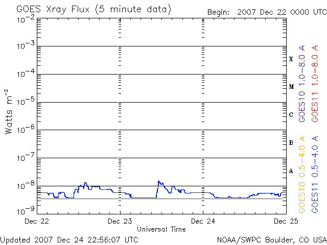 Die Daten in der obigen Grafik wurden geändert, um den Skalierungsfaktor des Space Weather Prediction Center (SWPC) zu entfernen. Durch den SWPC-Skalierungsfaktors für die Flare-Indizes werden die operativen Daten um 42 % kleiner angegeben als für die wissenschaftlichen Qualitätsdaten. Der Skalierungsfaktor wurde auch aus der Liste der Sonneneruptionen entfernt, um die tatsächlichen physikalischen Einheiten wiederzugeben.
