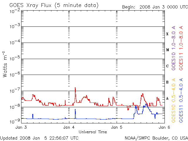 Die Daten in der obigen Grafik wurden geändert, um den Skalierungsfaktor des Space Weather Prediction Center (SWPC) zu entfernen. Durch den SWPC-Skalierungsfaktors für die Flare-Indizes werden die operativen Daten um 42 % kleiner angegeben als für die wissenschaftlichen Qualitätsdaten. Der Skalierungsfaktor wurde auch aus der Liste der Sonneneruptionen entfernt, um die tatsächlichen physikalischen Einheiten wiederzugeben.
