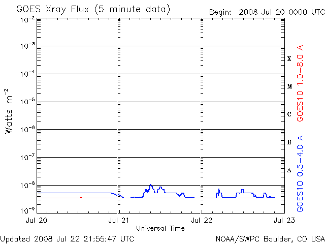 Die Daten in der obigen Grafik wurden geändert, um den Skalierungsfaktor des Space Weather Prediction Center (SWPC) zu entfernen. Durch den SWPC-Skalierungsfaktors für die Flare-Indizes werden die operativen Daten um 42 % kleiner angegeben als für die wissenschaftlichen Qualitätsdaten. Der Skalierungsfaktor wurde auch aus der Liste der Sonneneruptionen entfernt, um die tatsächlichen physikalischen Einheiten wiederzugeben.