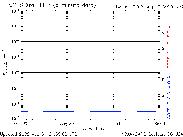 Die Daten in der obigen Grafik wurden geändert, um den Skalierungsfaktor des Space Weather Prediction Center (SWPC) zu entfernen. Durch den SWPC-Skalierungsfaktors für die Flare-Indizes werden die operativen Daten um 42 % kleiner angegeben als für die wissenschaftlichen Qualitätsdaten. Der Skalierungsfaktor wurde auch aus der Liste der Sonneneruptionen entfernt, um die tatsächlichen physikalischen Einheiten wiederzugeben.